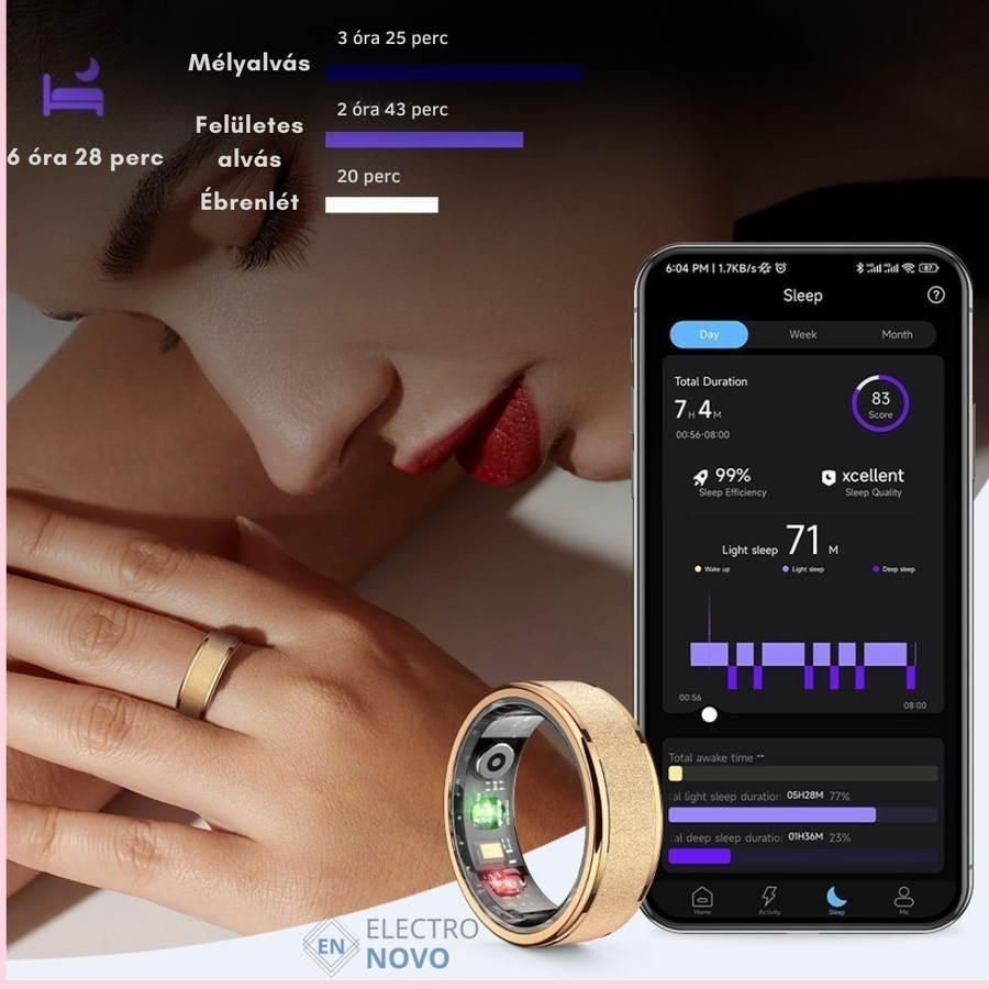Az okosgyűrűnk figyeli az alvásod minőségét, időtartamát és fázisait, így pontos képet kapsz a pihenésedről. A jobb alvás fokozza a koncentrációd, erősíti az immunrendszered és hosszú távon javítja az egészséged.